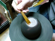 樹の種類(導管の太さ・向き)や形状、用途により着せる箇所が変わります。椀ですと、内の底、裏の底、天縁(口の当たるところ)、高台縁(置いたとき当たるところ)が一般的です。