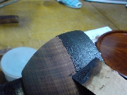 2辺地より細かい3辺地の粉を、砥の粉・生漆を練ったものに混ぜ合わせて、2辺地までの箆(へら)付けの境目を無くすことも考えて、ここでは刷毛で付けます。